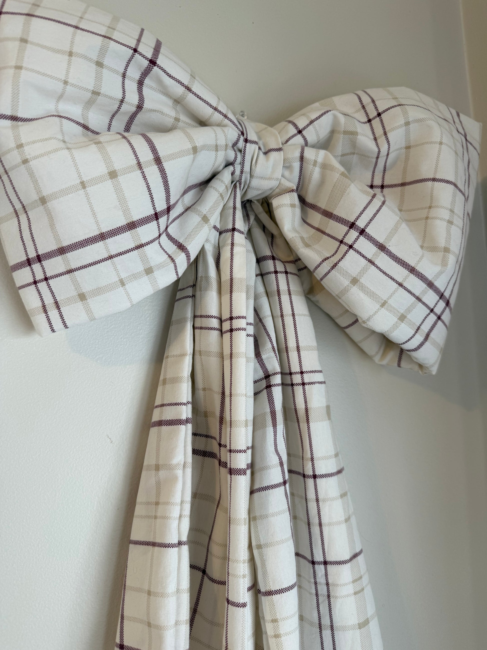This handcrafted bow features a soft cream base accented by maroon and beige plaid — a perfect mix of cozy and classic. Its warm, neutral tones make it ideal for seasonal décor, from fall harvest displays to winter wreaths and home accents.