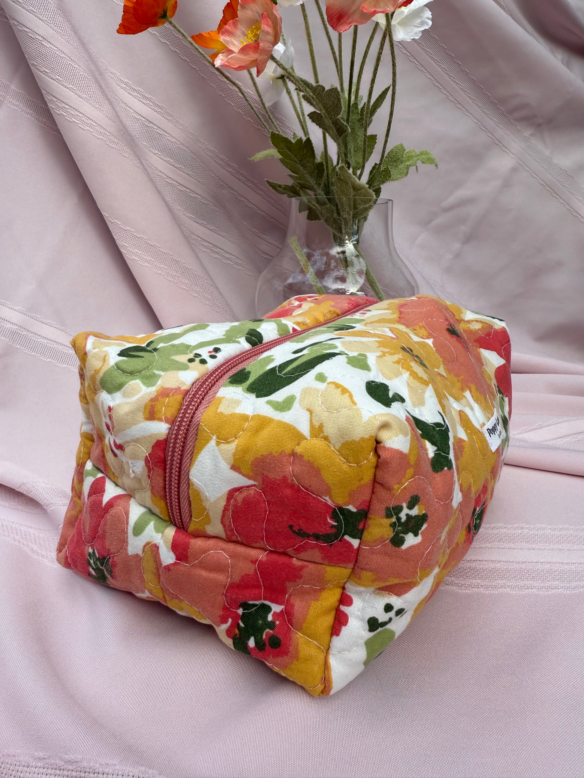 Handmade with love from recycled vintage fabric, this quilted boxy bag is the perfect mix of functional and one-of-a-kind. The bright floral design adds a cheerful touch while the spacious interior keeps your essentials organized. Use it as a makeup bag, travel pouch, or everyday catch-all. Each piece is unique, made in small batches with carefully sourced fabrics.