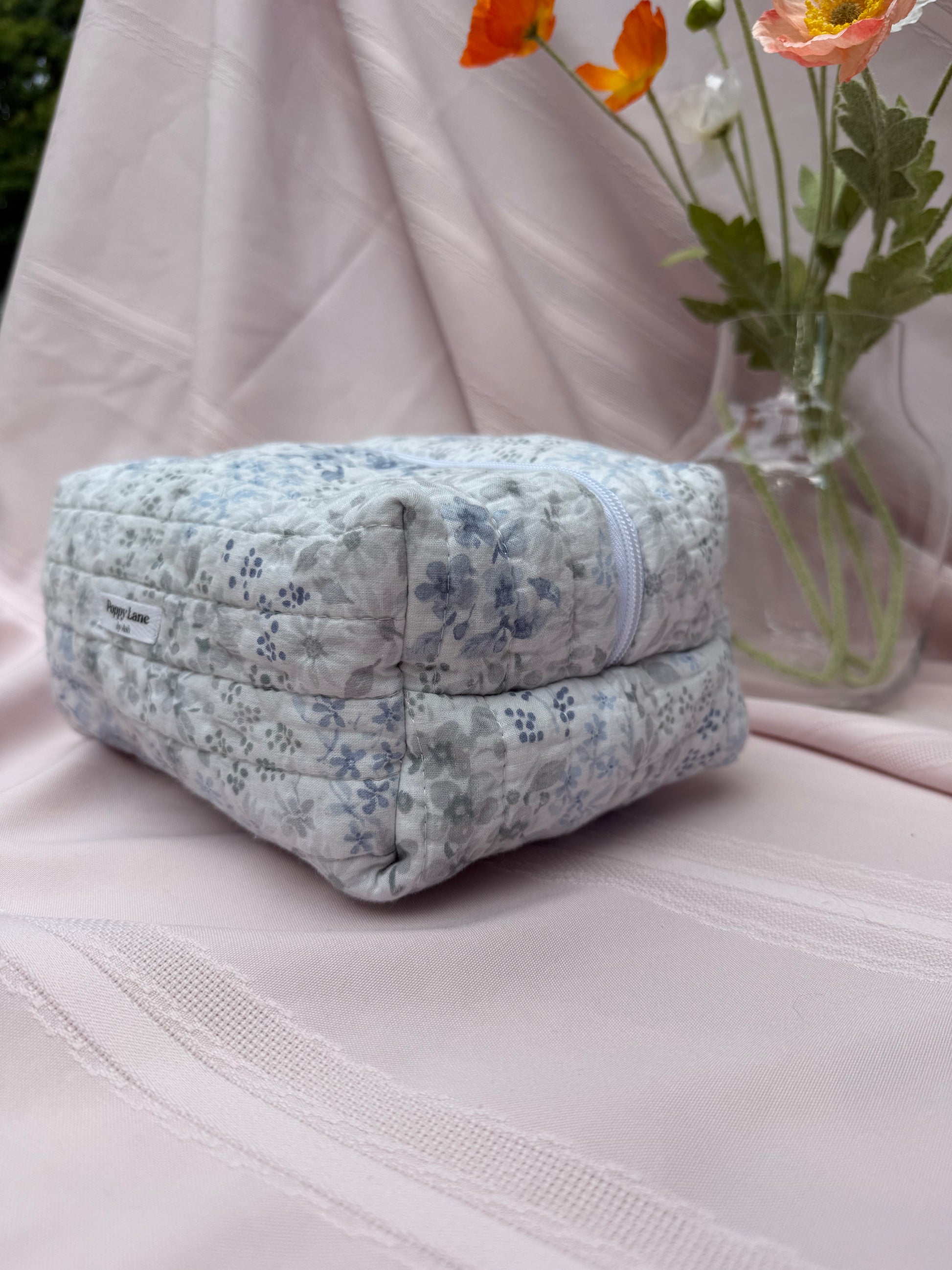 Inspired by a quiet meadow, this blue floral quilted boxy bag is handmade with thrifted vintage fabric for a soft and timeless look. The gentle blue and gray floral pattern feels fresh and calming, while the quilted design adds both durability and charm. Roomy enough for makeup, toiletries, or craft supplies, this pouch is a functional piece of slow-made beauty.